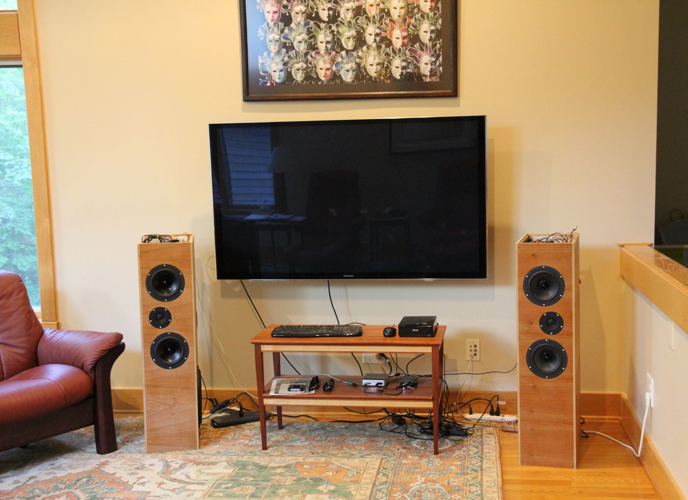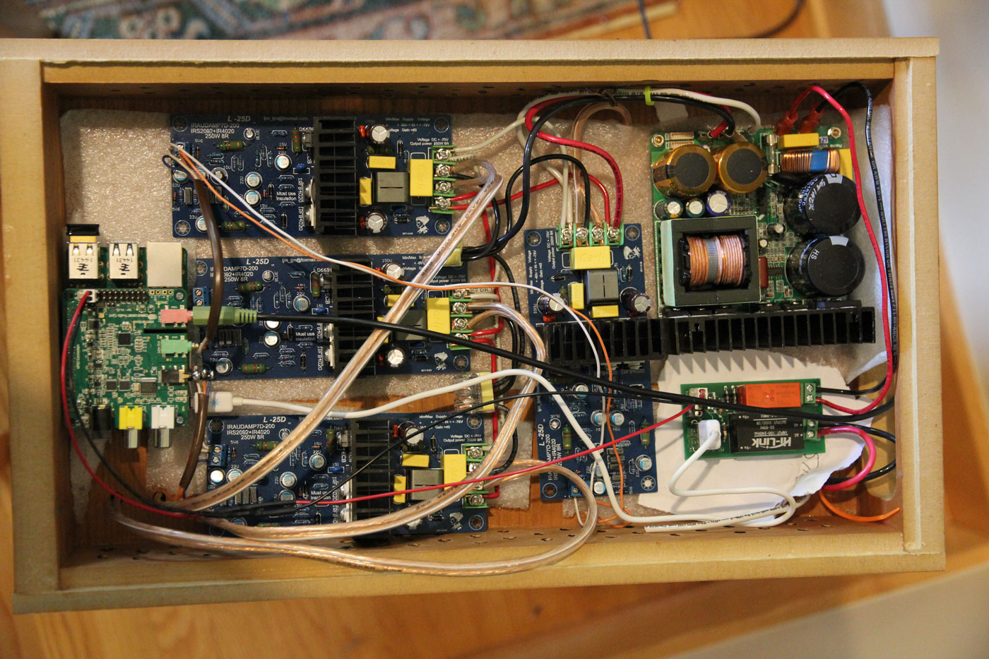 A Raspberry pi2 drives 4 Class D 200Wpc amplifiers. Each amp powers one speaker-driver.